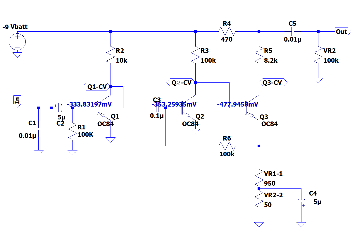 左端のギター回路はシングルコイルピックアップで250KΩポットを想定しています。