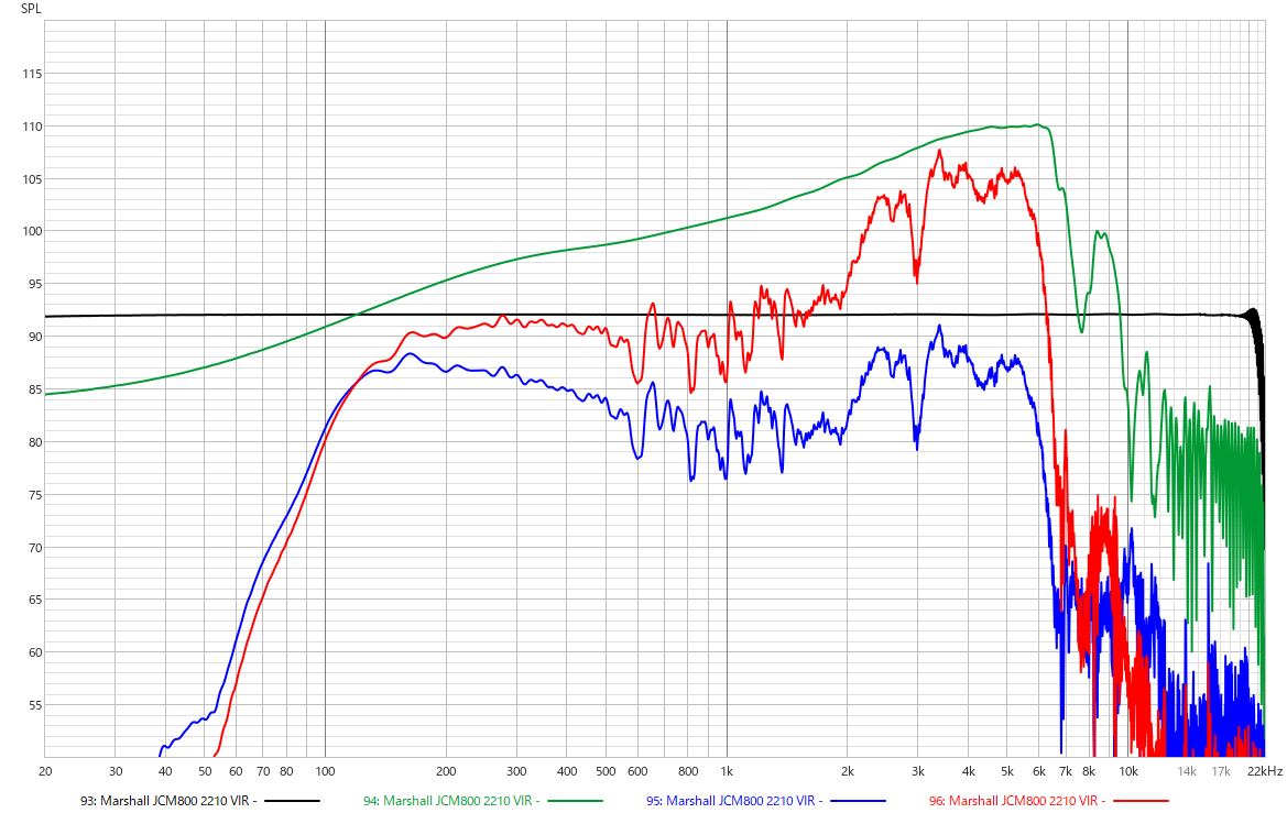 下のグラフの緑線がバイパス時、赤線がRAT2(DISTORTION=0、FILTER=0、VOLUME=10)をONにした時の周波数特性です。